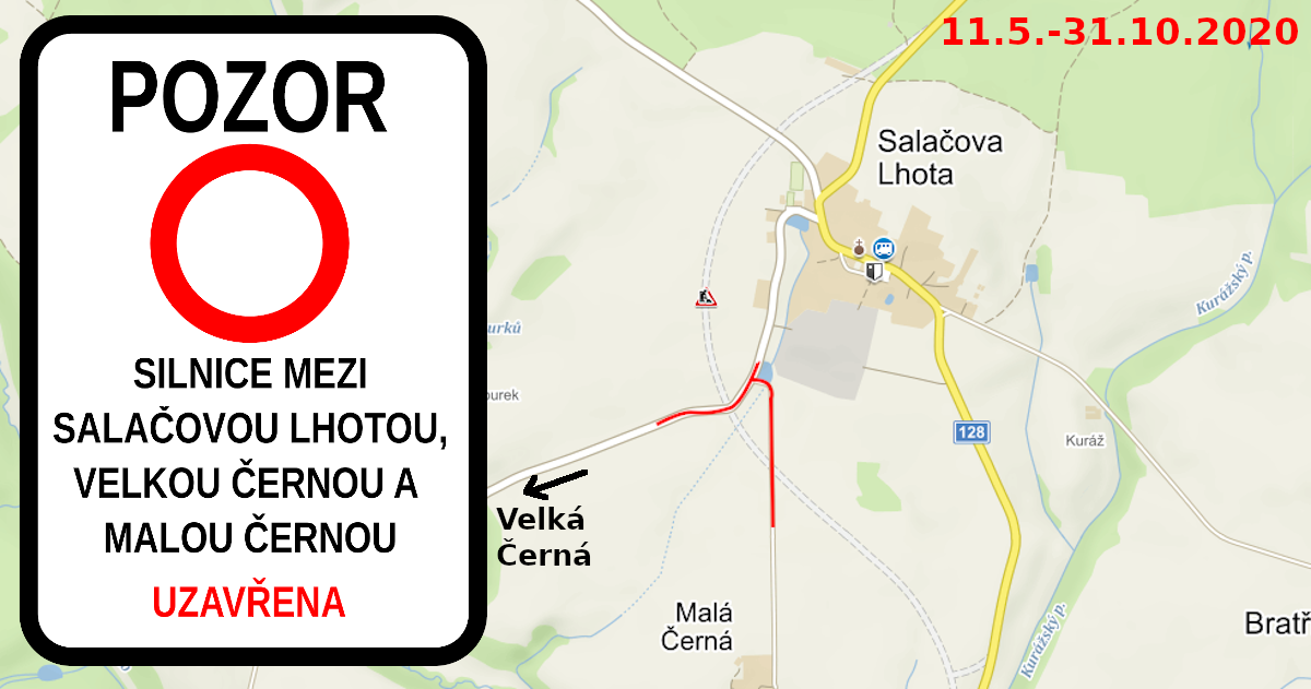 Podle veřejné vyhlášky bude od 11.5.2020 do 31.10.2020 uzavřena silnice mezi Salačovou Lhotou a Velkou a Malou černou v oblasti odbočky na Malou černou. Schema viz obrázek. Objízdné trasy vedou