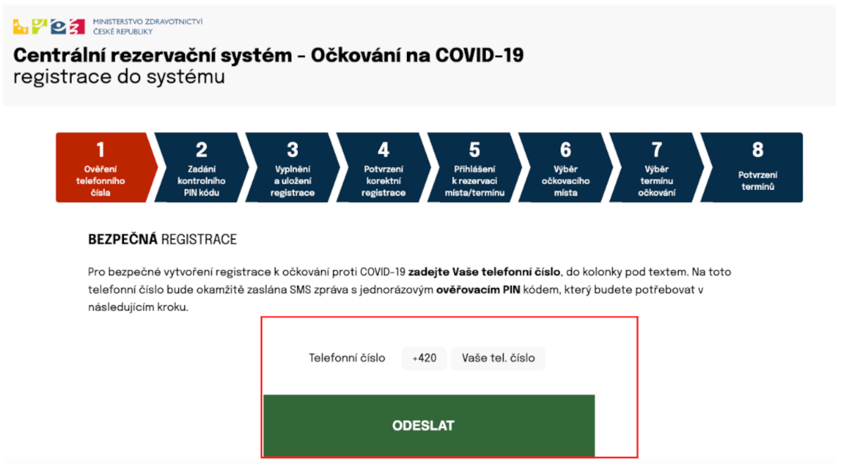 Prvním krokem registrace je zadání mobilního telefonního čísla, na které budou registrované osobě doručován PIN. PIN bude doručen pomocí SMS. PIN je potřebný pro pokračování v registrace. Při pomoci s registrací můžete použít i své telefonní číslo, ale musíte zajistit předání pozvánky k rezervaci konkrétního termínu. Jedno telefonní číslo je možné použít pro více registrací. Zadejte mobilní číslo a potvrďte klinutím na ODESLAT.