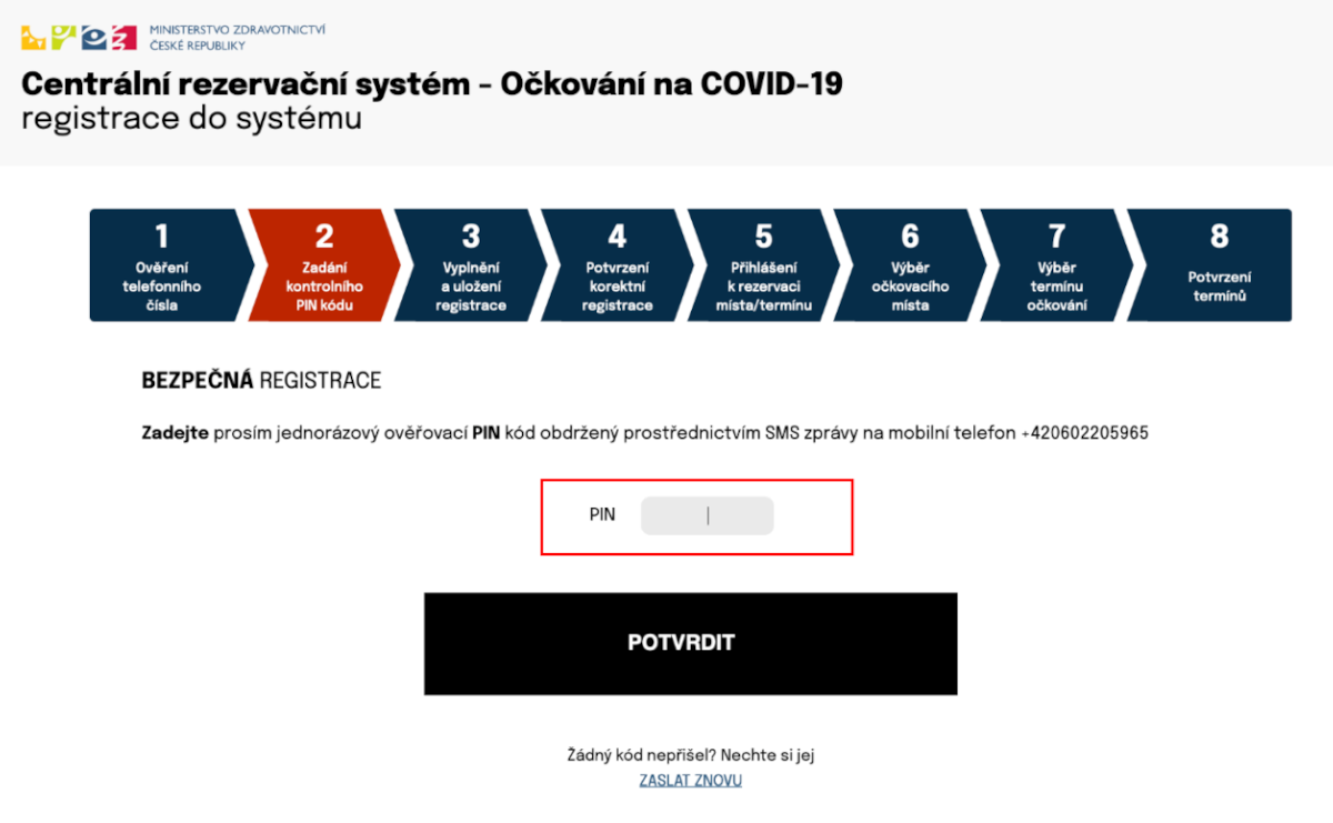 Vyčkejte, až na mobilní telefon se zadaným číslem dorazí SMS zpráva. Zpráva bude obsahovat PIN. PIN ze zprávy zadejte do formuláře a klikněte na POTVRDIT.