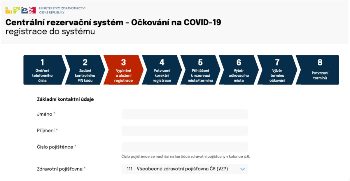 Do kolonek formuláře zadejte osobní údaje registrované osoby, zdravotní pojišťovnu a číslo pojištěnce podle pokynu ve formuláři.