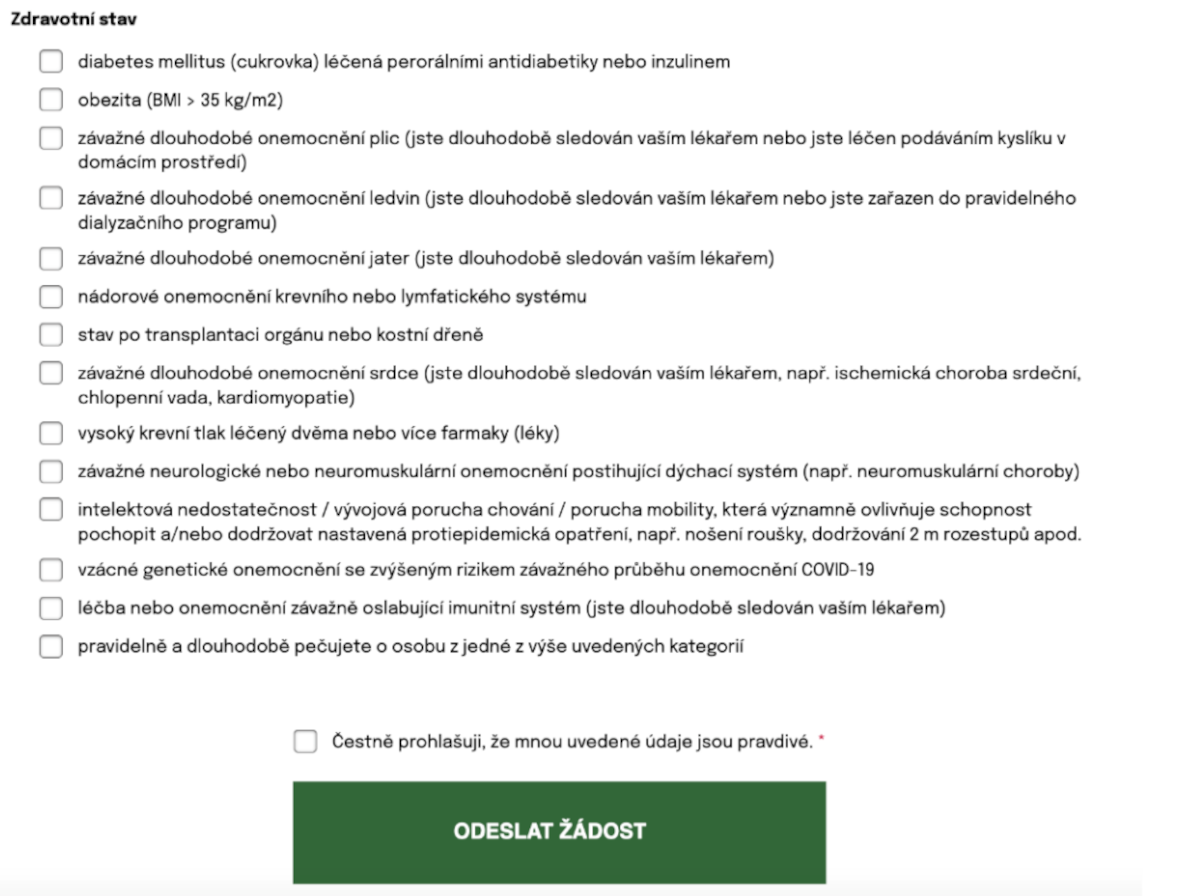 V daší části formuláře kliknutím do čtverečků zaškrtněte podle skutečnosti informace o zdravotním stavu registrované osoby. Nezapomeňte na potvrzení Čestného prohlášení kliknutím do posledního čtverečku. Pokud některý bod zaškrtnete omylem, opakovaným kliknutím je možné zaškrtnutí zrušit. Po zadání potvrďte a odešlete žádost kliknutím na ODESLAT ŽADOST.