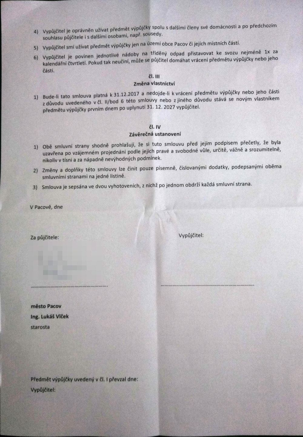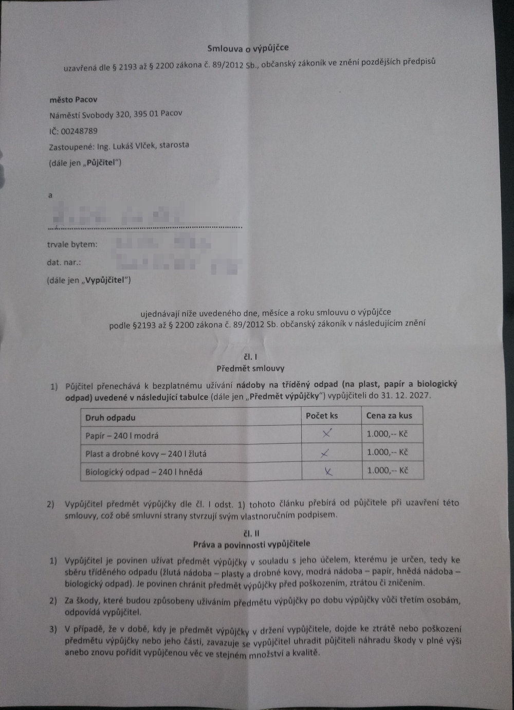 Vyzvednout si popelnice zdarma znamená, že na místě musíte podepsat “Smlouvu o výpůjčce” (kompletní text viz níže). Proč není smlouva o výpůjčce přílohou oznámení? Předložit bez varování k podpisu smlouvu, byť krátkou, není úplně vstřícné jednání. Zavedení systému odvozu od domu (door-to-door) probíhá ve všech obcích DSO SOMPO. Jinde je tato informace součástí oznámení (např. Žirovnice, Počátky, Horní Cerekev)