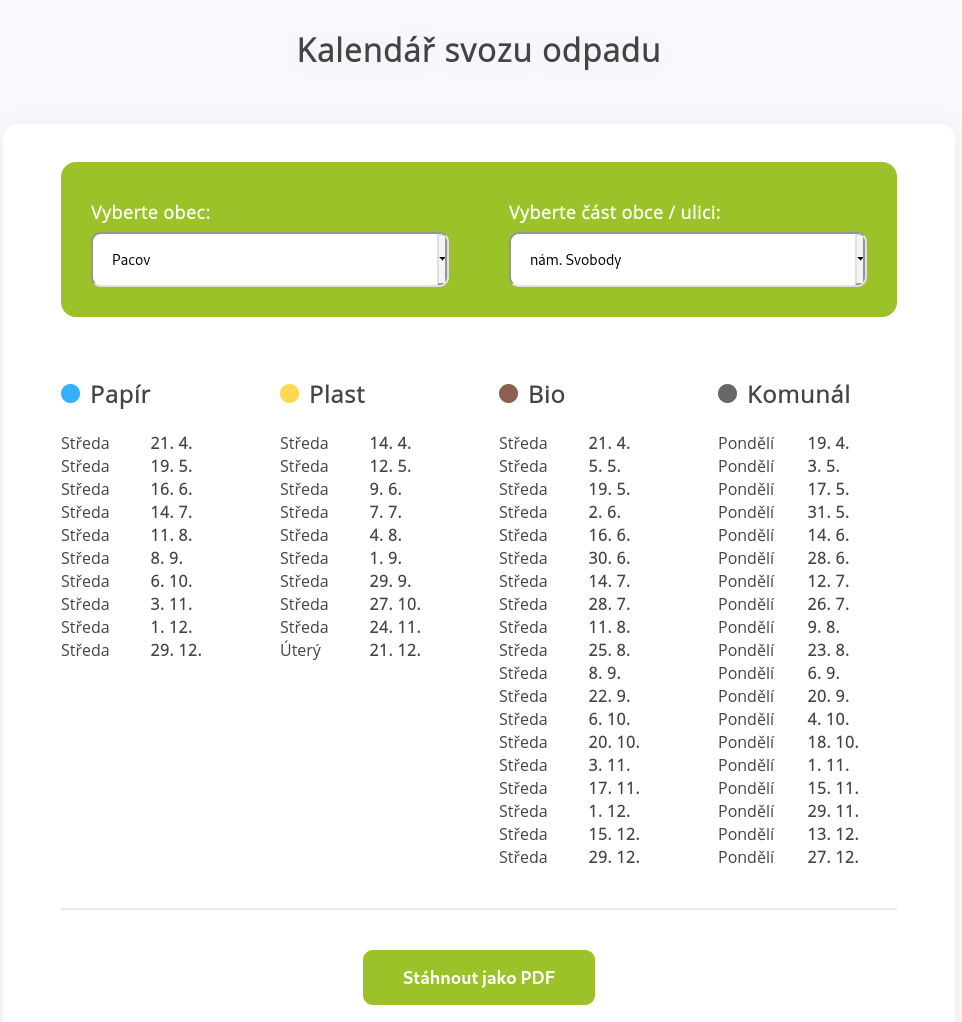 Pro zvolenou lokalitu se vygeneruje konkrétní kalendář svozů pro rok 2021. Kalendář si také můžete stáhnout ve formě PDF souboru k tisku.