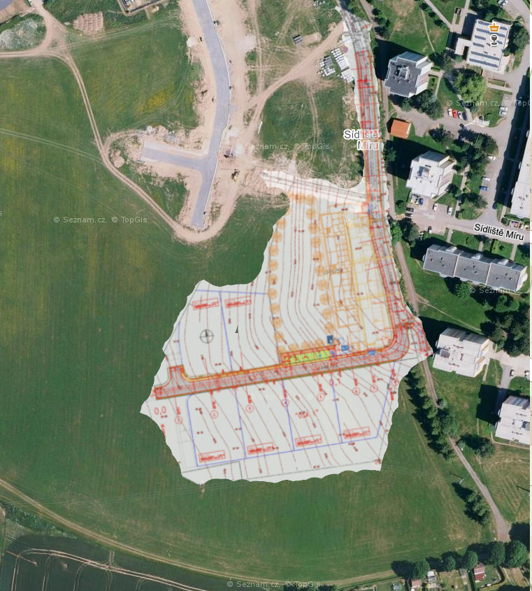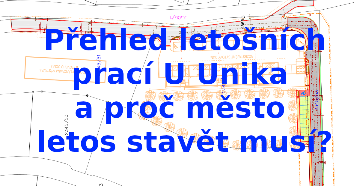 Město letos U Unika postaví silnici, chodník, vodovod a kanalizaci (dešťovou a splaškovou) v délce cca 300 metrů. Z výkresu v projektové dokumentaci jsme přenesli podstatnou část do letecké mapy lokality včetně náhledu budoucích parcel pro rodinné domy. Silnice navazuje na dnes slepou větev a vede podél cesty nad sídlištěm a za bytovým domem se zatáčí v pravém úhlu doprava do kopce a dále vede mezi budoucími parcelami a končí na budoucí křižovatce. Součástí stavby je také parkoviště a odbočka z budované silnice na existující cestu nad sídlištěm.
