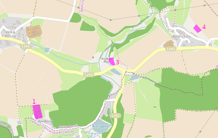 - 🗺️ změna 3 - Po pravé straně silnice Bedřichov - Velká Rovná za odbočkou na Cetoraz bude možné nově budovat venkovskou zástavbu vedle Brožkova mlýna.