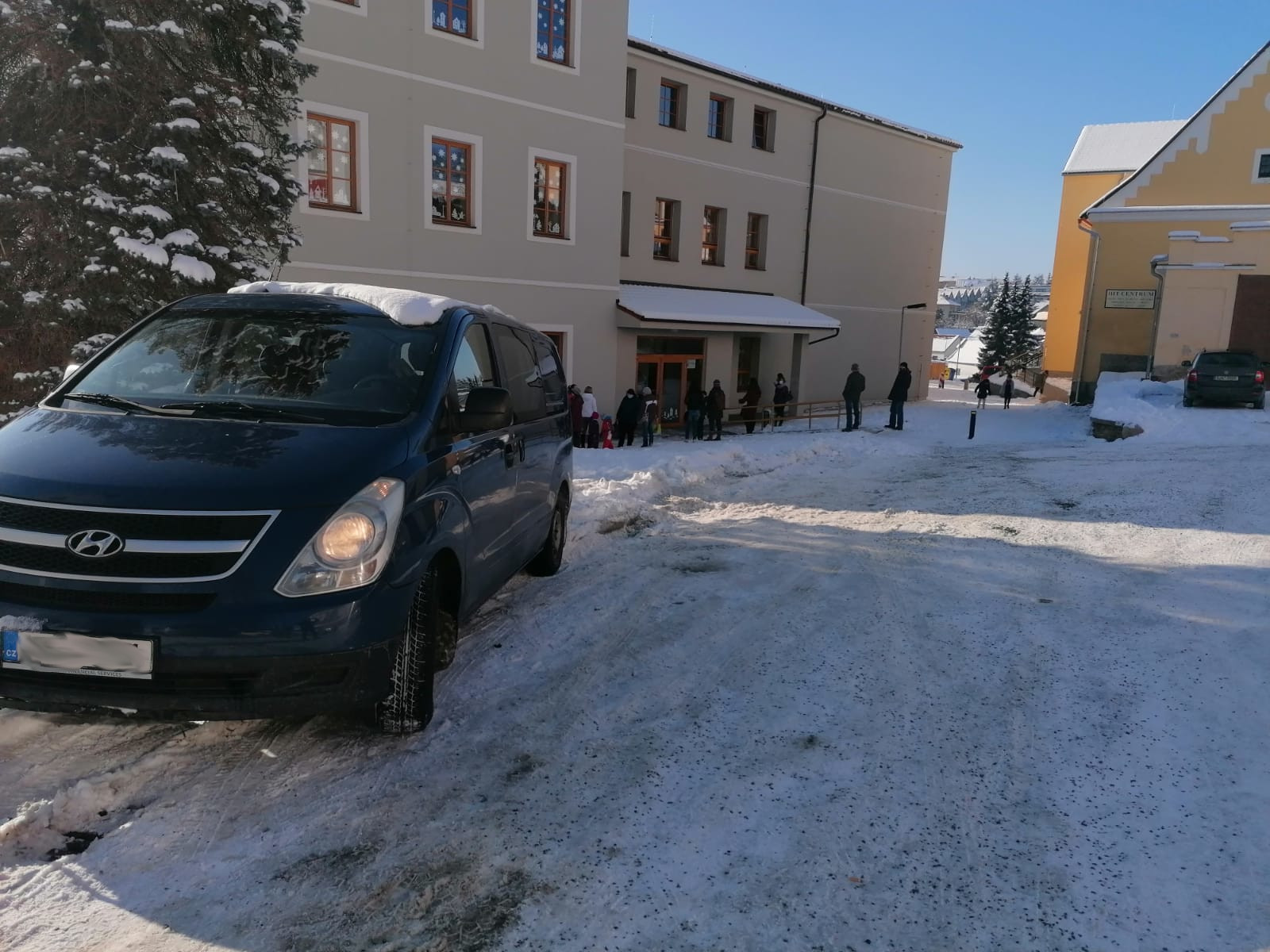 Auto u školy na zledovatělé silnici uježděné manévry auto otáčejících se před sloupkem nekontrolovaně sklouzlo až do trávy před školou.