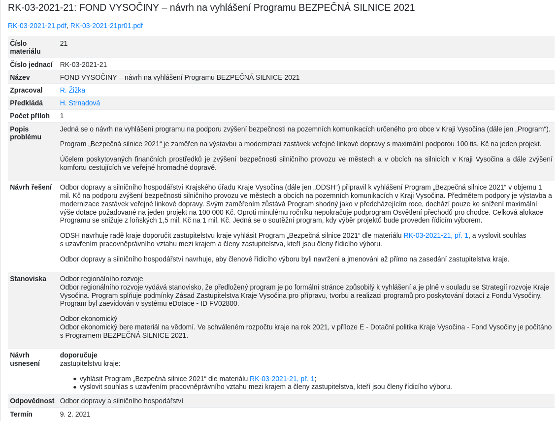 Když pro srovnání nahlédnete na stránky o jednáních rady Kraje Vysočina, budete zaplaveni informacemi a snadno dohledáte, nejen usnesení a zápisy, ale ve většině případů také podklady, na základě kterých rada rozhoduje. Podklady k jednomu náhodně vybranému bodu, který rada kraje řešila na svém posledním zasedání vypadá takto: