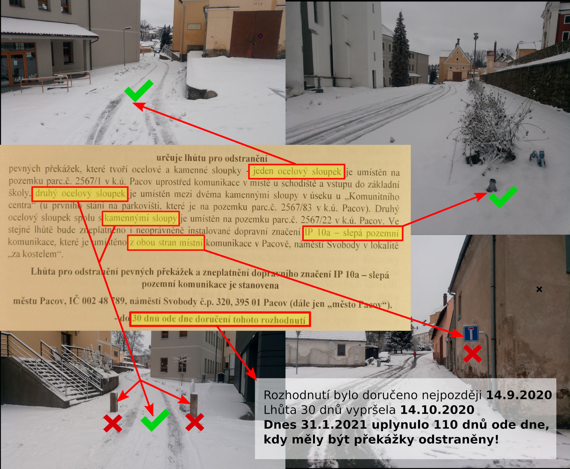 V pátek 29.1.2021 začalo město Pacov plnit povinnost uloženou rozhodnutím Odboru dopravy a začalo odstraňovat překážky a značení, které vybudovalo bez povolení. Ještě není hotovo. Zde stručná inventura ve směru průjezdu od fary: