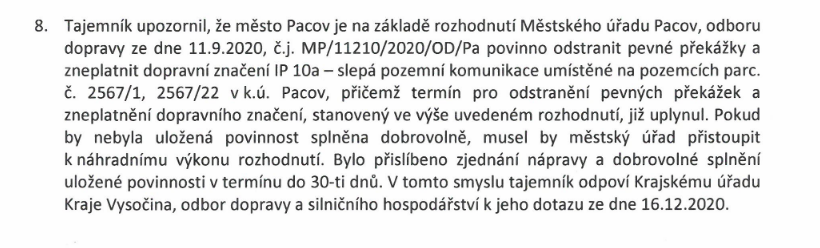 Město Pacov bez platného stavebního povolení a bez souhlasu odboru dopravy uzavřelo v lednu 2020 ulici za školou a kolem kulturního centra. Dnes má město nařízeno tento stav odstranit. Po 110 dnech od vypršení lhůty začalo město 29.1.2021 plnit uloženou povinnost a odstranilo kovové sklápěcí sloupky a značku slepá ulice ze strany od fary. Kamenné sloupky a značka slepá ulice z opačného směru stále nejsou odstraněné.
