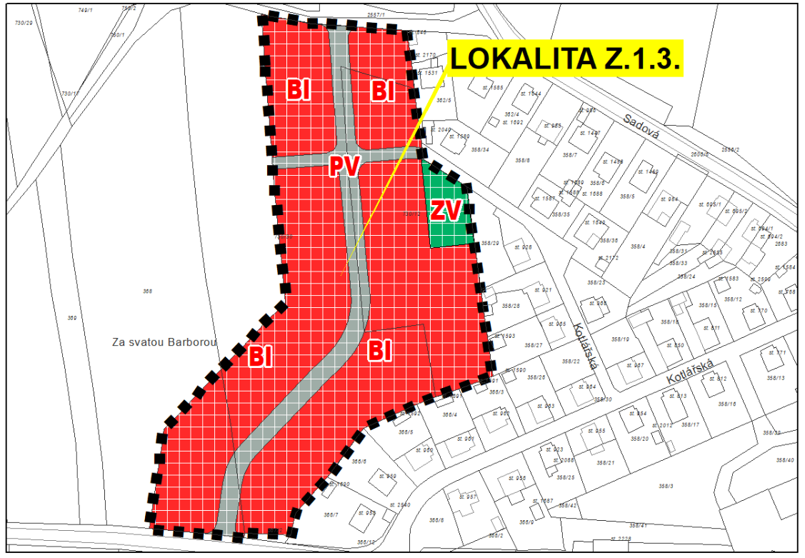 - Lokalita Z.1.3 - vyhledávací studie navrhuje doplnění nové ulice propojující silnici III. třídy na jihu řešeného území a ulici Sadovou na severu. V řešeném území je vymezeno 21 stavebních pozemků o průměrné velikosti cca 1 046 m2.